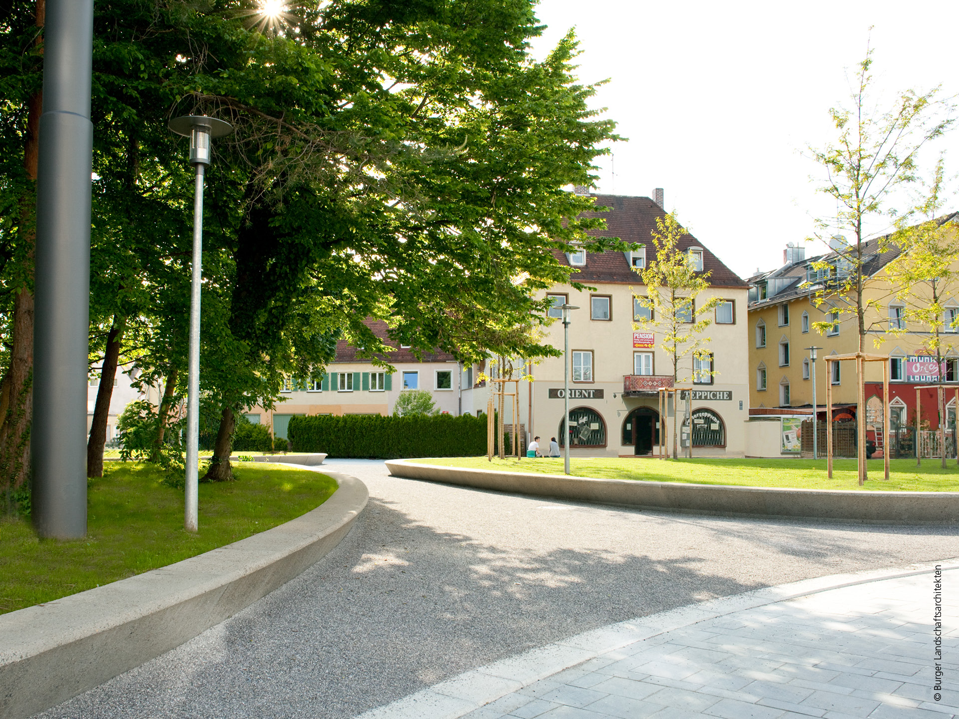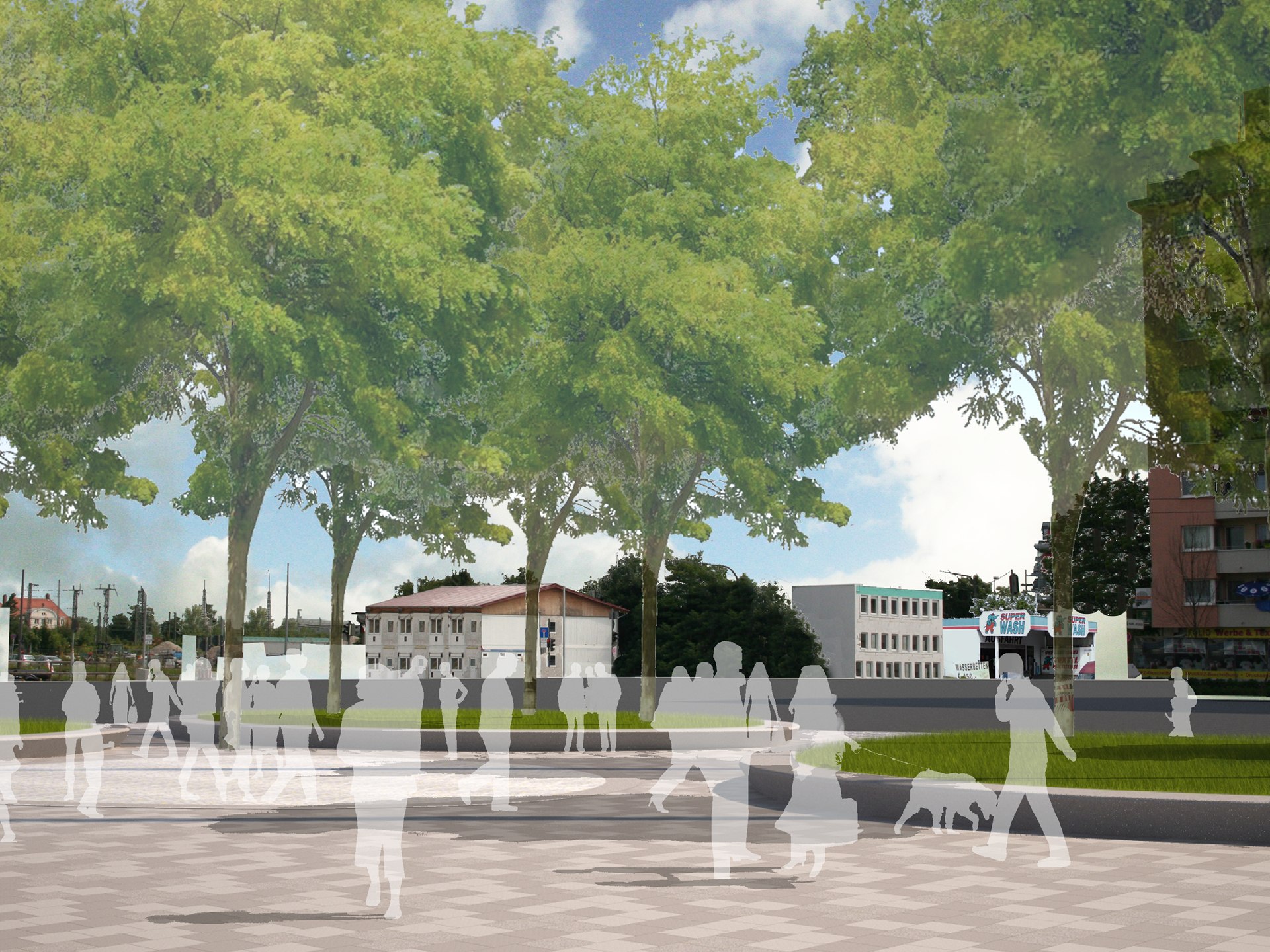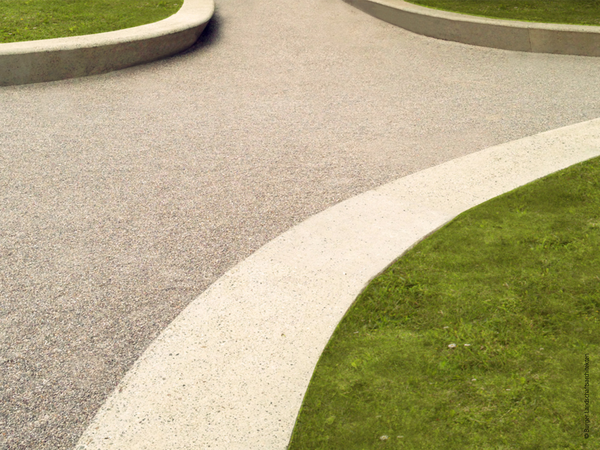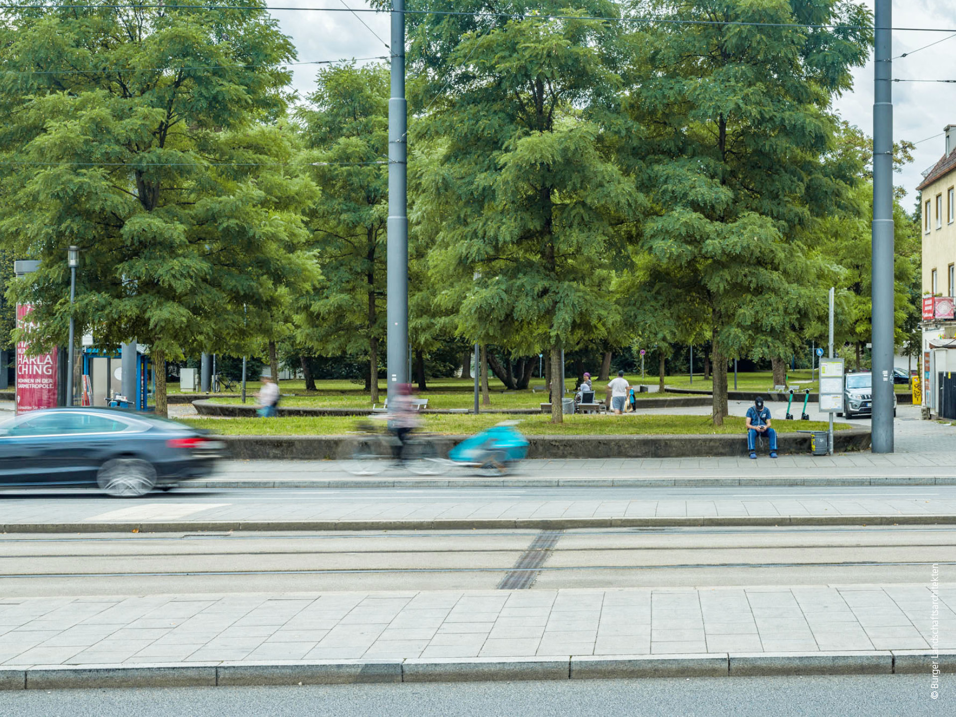 Die Gestaltung des neu entstehenden Platzes basiert auf der Grundhaltung der Fortführung des bestehenden übergeordneten Grünzugs als „Grüner Layer“ zwischen Cervantes- und Michael-Beer-Straße in die Platzfläche als „Steinerner Layer“. Der Grünzug wird dadurch räumlich und qualitativ bis an die Landsberger Strasse herangeführt. Auf den um 45 cm erhöhten Raseninseln, die in unregelmäßig geschwungenen, breiten Betonein-fassungen liegen, werden Robinien in freier Stellung platziert. Diese generieren durch ihr lichtes Laubbild ein lebendiges Licht und Schattenspiel, das dauerhafte Rasenwachstum auf den Inseln unterstützt und auch künftig eine Blickbeziehung zu den rahmenden Gebäuden ermöglichen. Anzahl und Dimension der Pflanzinseln sind so gewählt, dass einerseits eine angemessen große befestigte Fläche und Durchwegung entsteht, andererseits der „Grüne Layer“ als prägendes Element verstanden wird. Die bestehende Grünfläche, auf der alle Großbäume erhalten werden, wird ebenfalls durch eine Betoneinfassung auf Sitzhöhe eingefasst. Die mit einer Unterschneidung ausgeführten Betoneinfassungen der Pflanzinseln bieten für die zu erwartenden Nutzung ausreichende Sitzgelegenheiten, so dass auf eine zusätzliche Möblierung verzichtet werden kann. Die befestigten Flächen gliedern sich in 2 Bereiche. Der zentrale Platzbereich mit dem Wegebezug Richtung Süden zum bestehenden Grünzug wird mit einem abgestreutem Mastixbelag im Erscheinungsbild einer Wassergebundenen Decke belegt. Die umlaufenden Gehbahnen sind als üblicher Ku Pla Plattenbelag 35*35 ausgeführt. Der Münchner Gehwegplattenbelag geht ohne Abgrenzung in die Gehbahnen an der Landsberger Straße und der Straße Am Knie über.